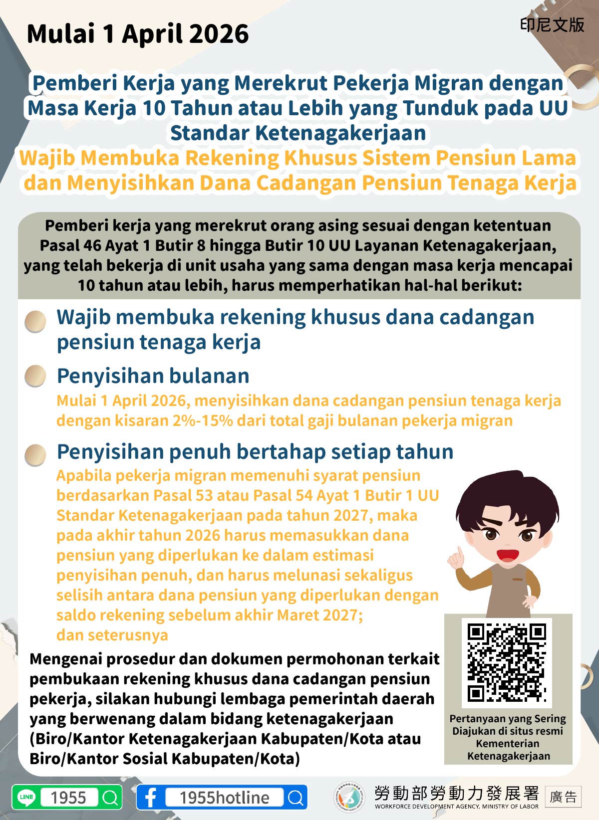 •Penyisihan bulanan : Mulai 1 April 2026, menyisihkan dana cadangan pensiun tenaga kerja dengan kisaran 2%-15% dari total gaji bulanan pekerja migran