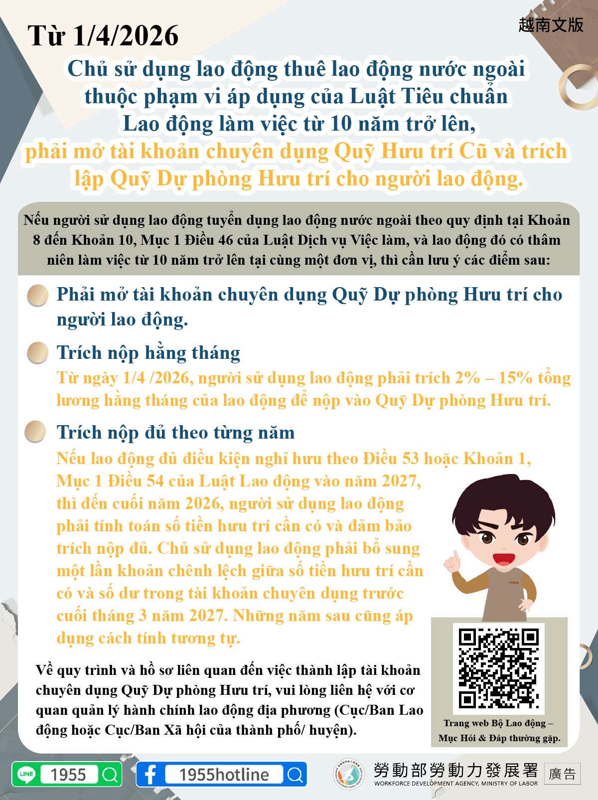 ▍Beginning on April 1, 2026 Employers who hire a foreign worker who has worked in Taiwan for 10 years or more under the provisions of the Basic Labor Act are required to establish a labor retirement reserve fund dedicated account, into which to pay labor retirement reserve funds.