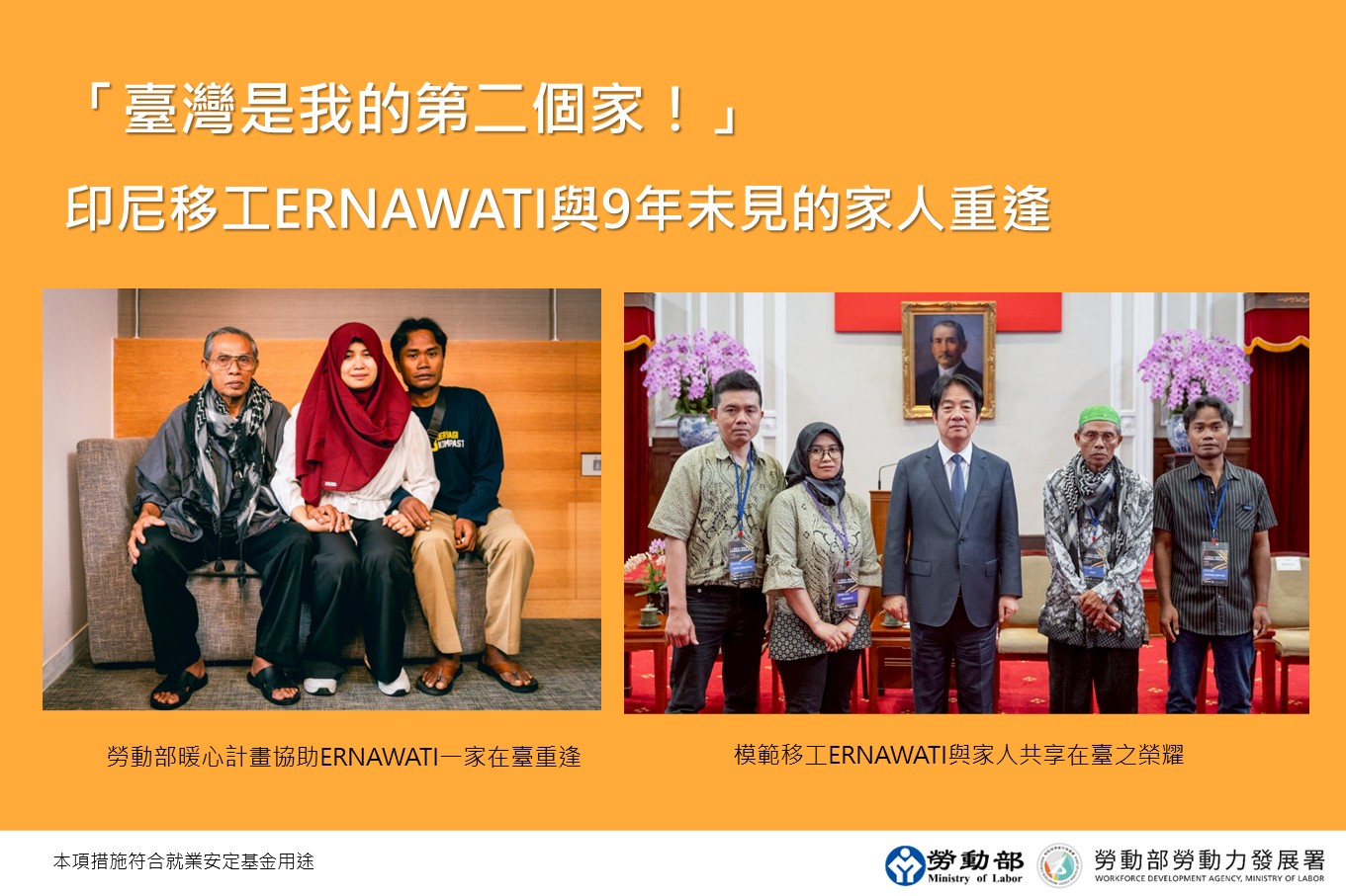13年前,印尼籍移工ERNAWATI為改善家計來到臺灣,憑藉著專業與愛心,她不僅成為備受信賴的家庭看護工,更在這片土地上寫下了動人的生命篇章。她的細心與良善深獲雇主肯定,為表揚她的傑出貢獻,勞動部特別邀請ERNAWATI分隔9年未見的父親與哥哥專程來臺,共同參與盛大的表揚典禮,見證這份得來不易的榮耀。