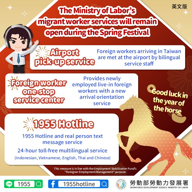 ▍The Ministry of Labor’s migrant worker services will remain open during the Spring Festival