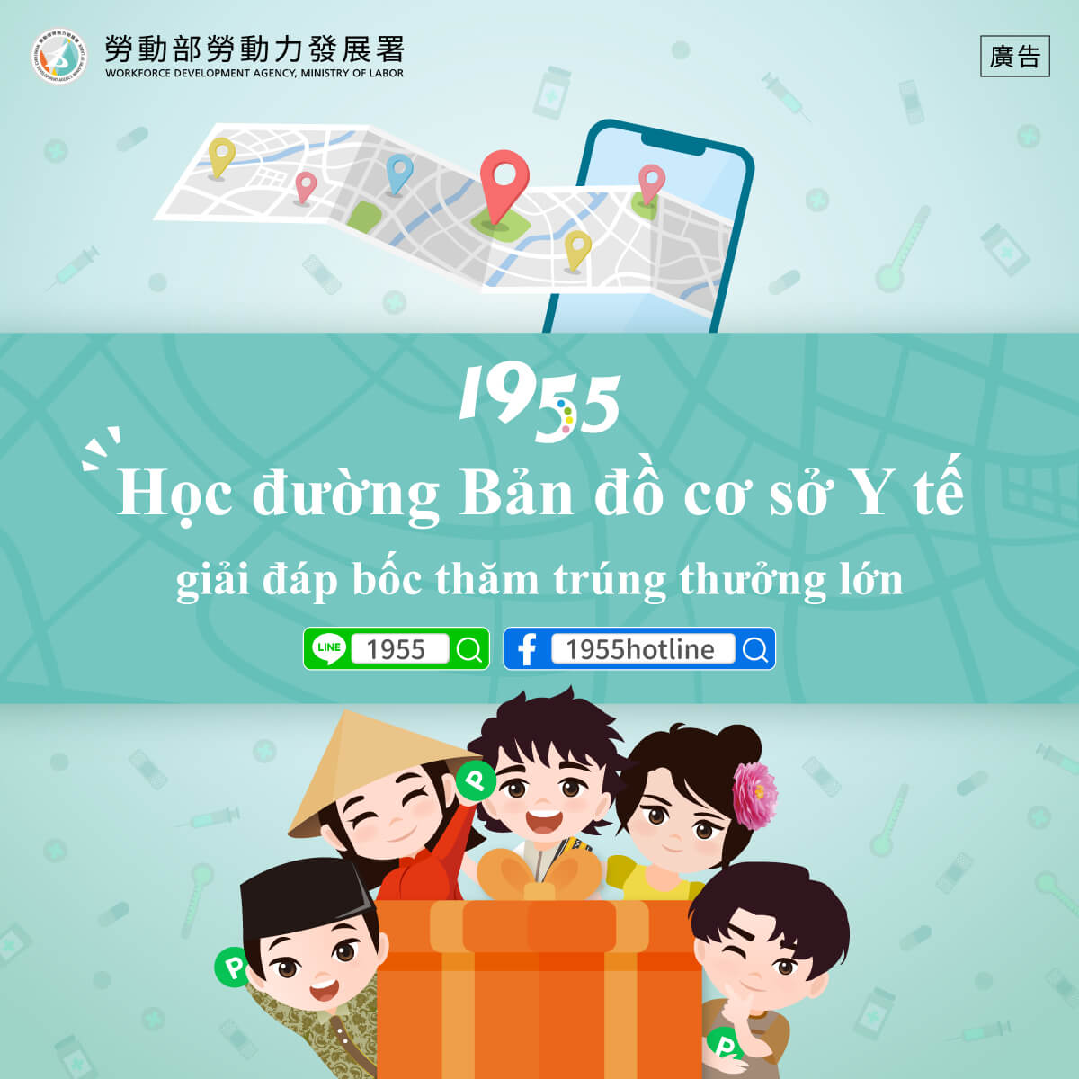 Hãy tham gia tài khoản LINE của 1955, để cùng nhau tìm hiểu về tính năng Bản đồ Y tế nhé! Nhấp vào liên kết hoạt động " Học đường Bản đồ cơ sở Y tế - giải đáp bốc thăm trúng thưởng lớn " liên kết hoạt động hoặc nút menu hình ảnh, trả lời các câu hỏi và quay lại hoạt động trang chủ để tham gia rút thăm trúng thưởng 10, 50 hoặc 100 ĐIỂM LINE! (Mỗi tài khoản chỉ được tham gia một lần rút thăm trong suốt thời gian diễn ra hoạt động.)