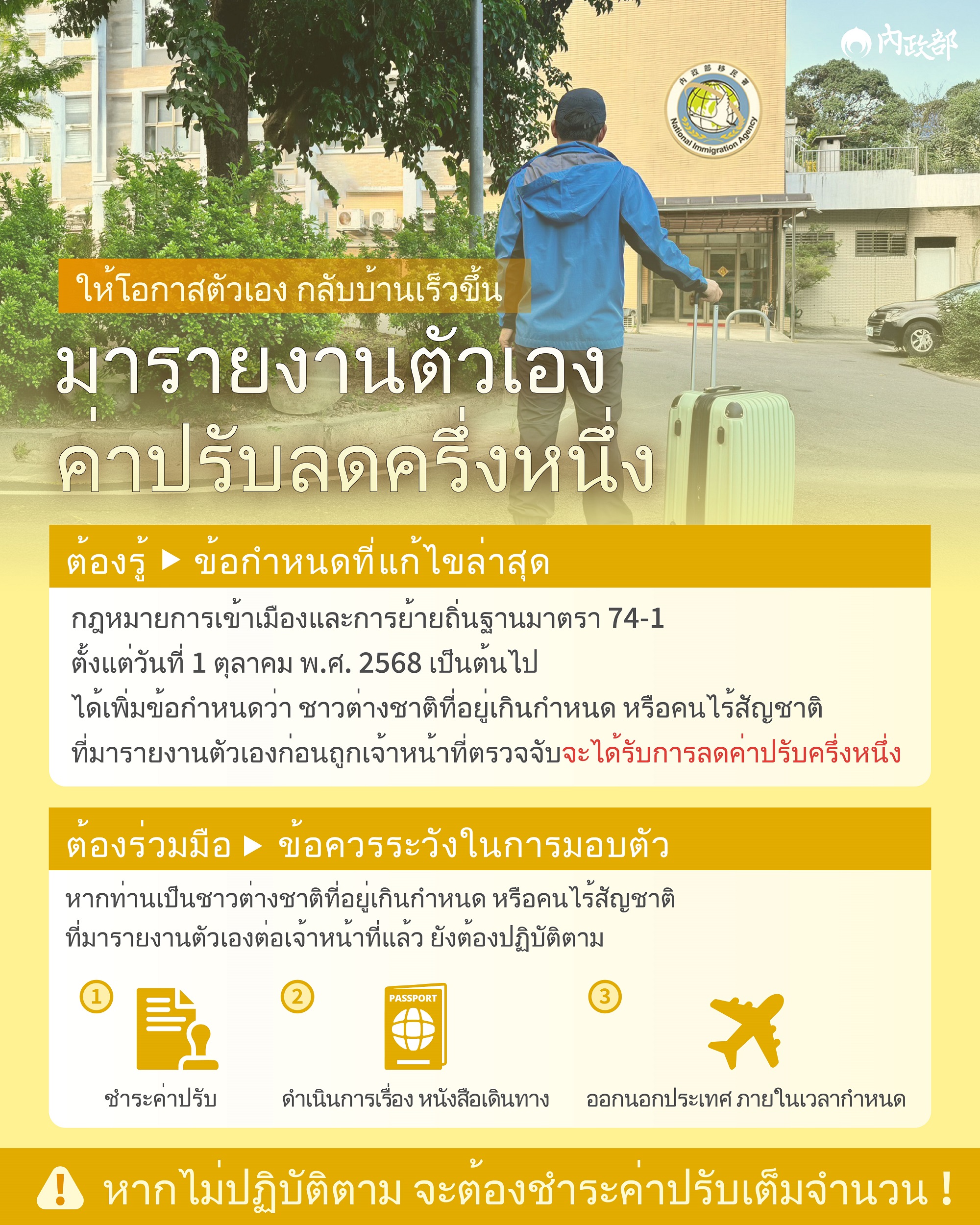 活動訊息:สำนักงานตรวจคนเข้าเมือง (NIA): มารายงานตัวเอง ค่าปรับลดครึ่งหนึ่ง