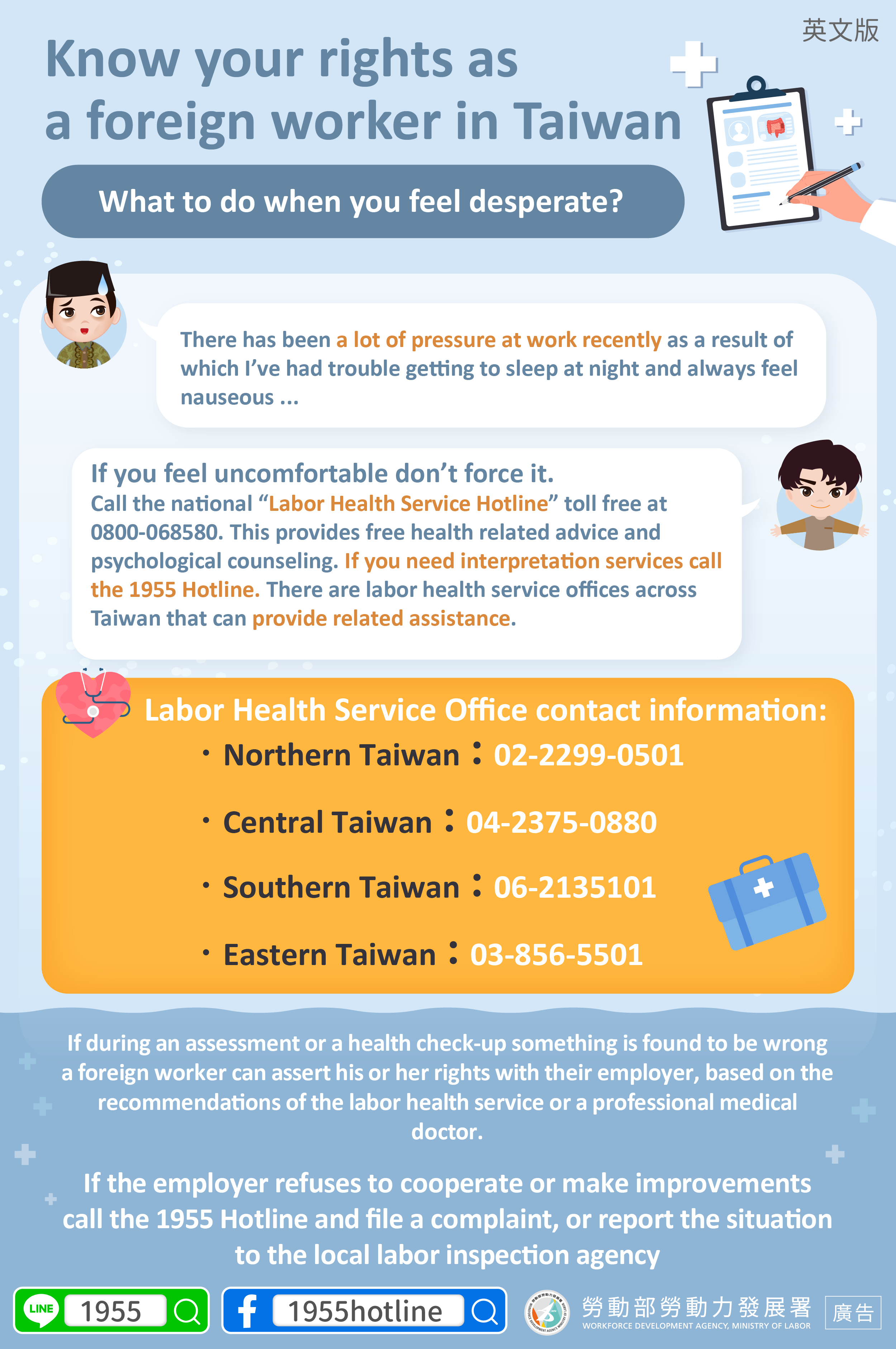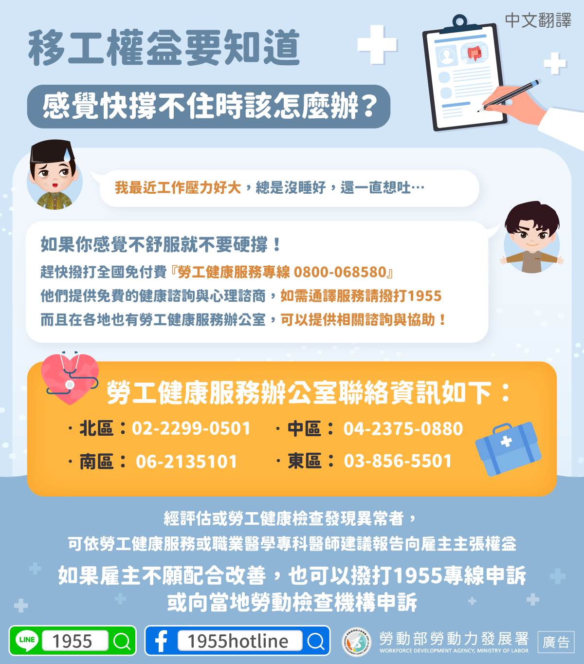 B:If you feel uncomfortable don’t force it.Call the national “Labor Health Service Hotline” toll free at 0800-068580. This provides free health related advice and psychological counseling. If you need interpretation services call the 1955 Hotline. There are labor health service offices across Taiwan that can provide related assistance.