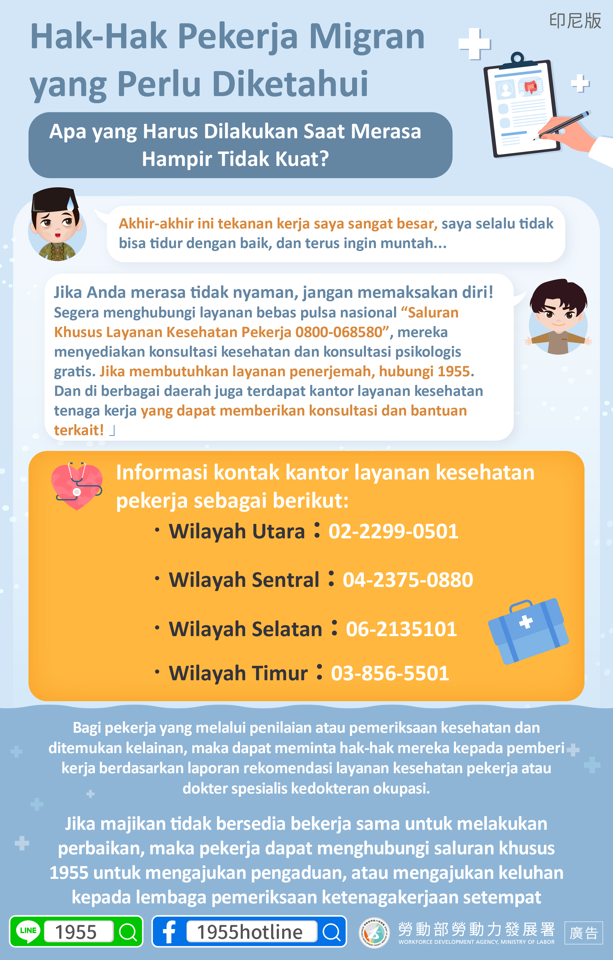B:Jika Anda merasa tidak nyaman, jangan memaksakan diri! Segera menghubungi layanan bebas pulsa nasional “Saluran Khusus Layanan Kesehatan Pekerja 0800-068580”, mereka menyediakan konsultasi kesehatan dan konsultasi psikologis gratis. Jika membutuhkan layanan penerjemah, hubungi 1955. Dan di berbagai daerah juga terdapat kantor layanan kesehatan tenaga kerja yang dapat memberikan konsultasi dan bantuan terkait! 」