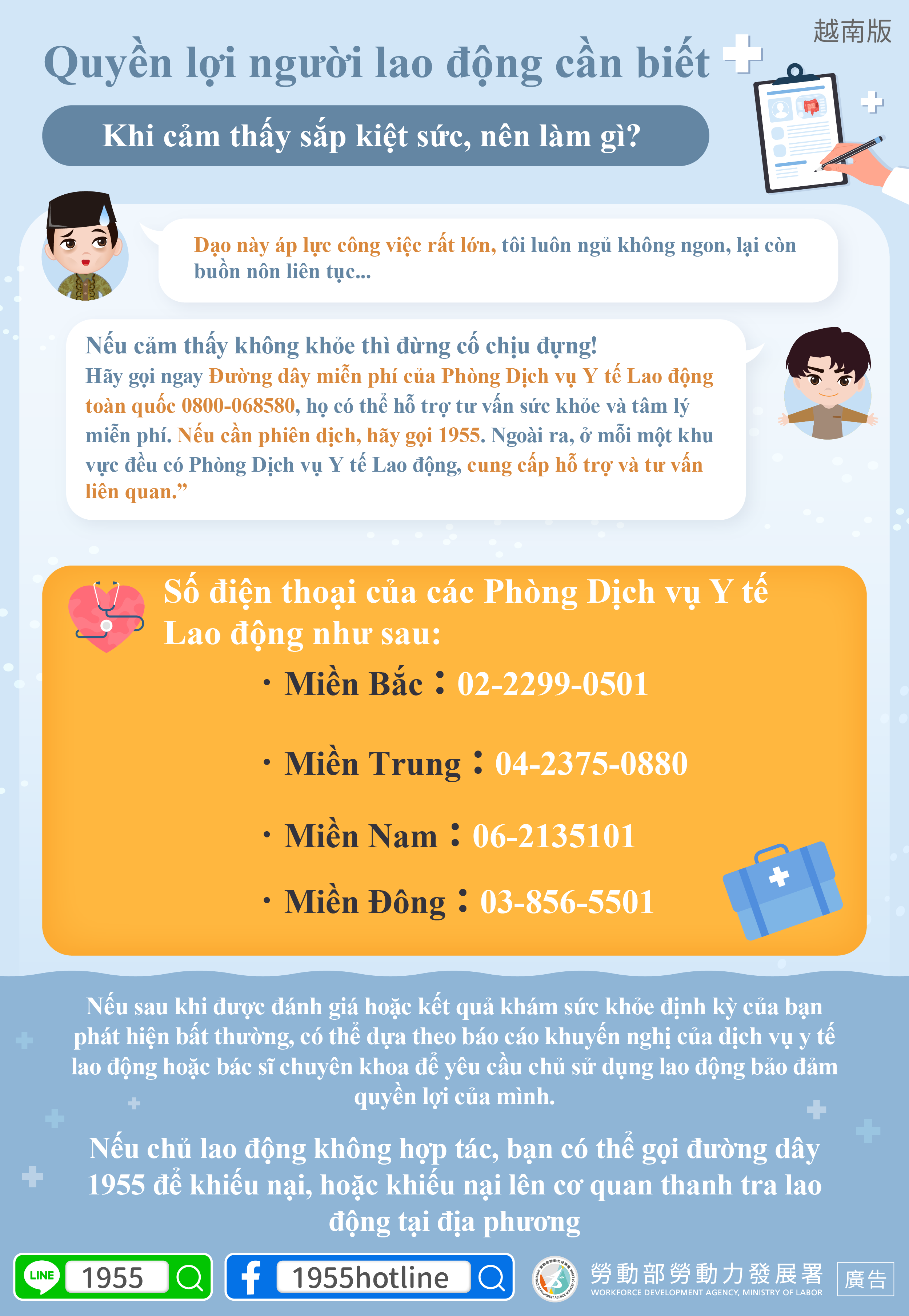 B:Nếu cảm thấy không khỏe thì đừng cố chịu đựng! Hãy gọi ngay Đường dây miễn phí của Phòng Dịch vụ Y tế Lao động toàn quốc 0800-068580, họ có thể hỗ trợ tư vấn sức khỏe và tâm lý miễn phí. Nếu cần phiên dịch, hãy gọi 1955. Ngoài ra, ở mỗi một khu vực đều có Phòng Dịch vụ Y tế Lao động, cung cấp hỗ trợ và tư vấn liên quan.”