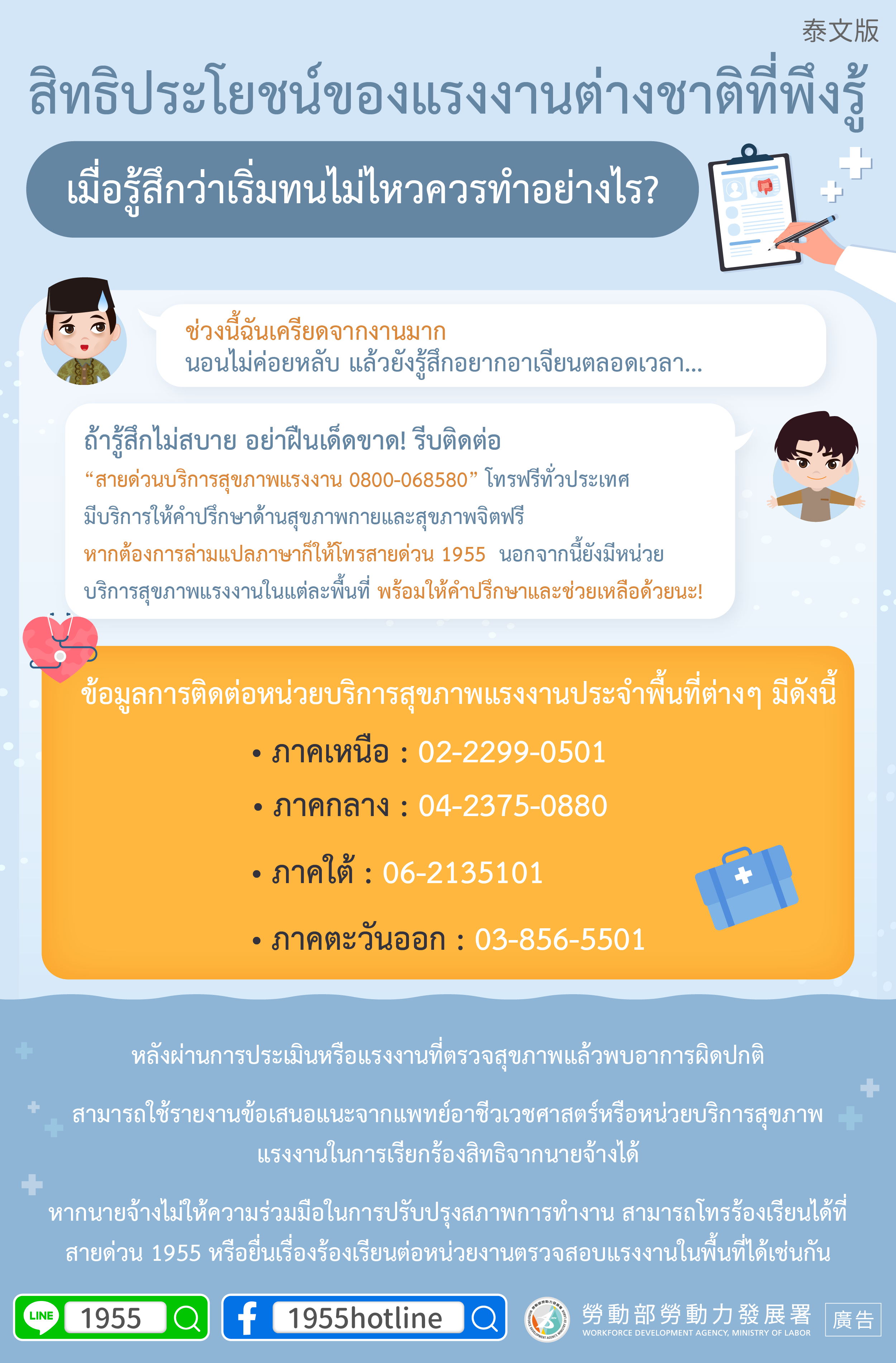B:ถ้ารู้สึกไม่สบาย อย่าฝืนเด็ดขาด! รีบติดต่อ “สายด่วนบริการสุขภาพแรงงาน 0800-068580” โทรฟรีทั่วประเทศ มีบริการให้คำปรึกษาด้านสุขภาพกายและสุขภาพจิตฟรี หากต้องการล่ามแปลภาษาก็ให้โทรสายด่วน 1955  นอกจากนี้ยังมีหน่วยบริการสุขภาพแรงงานในแต่ละพื้นที่ พร้อมให้คำปรึกษาและช่วยเหลือด้วยนะ!