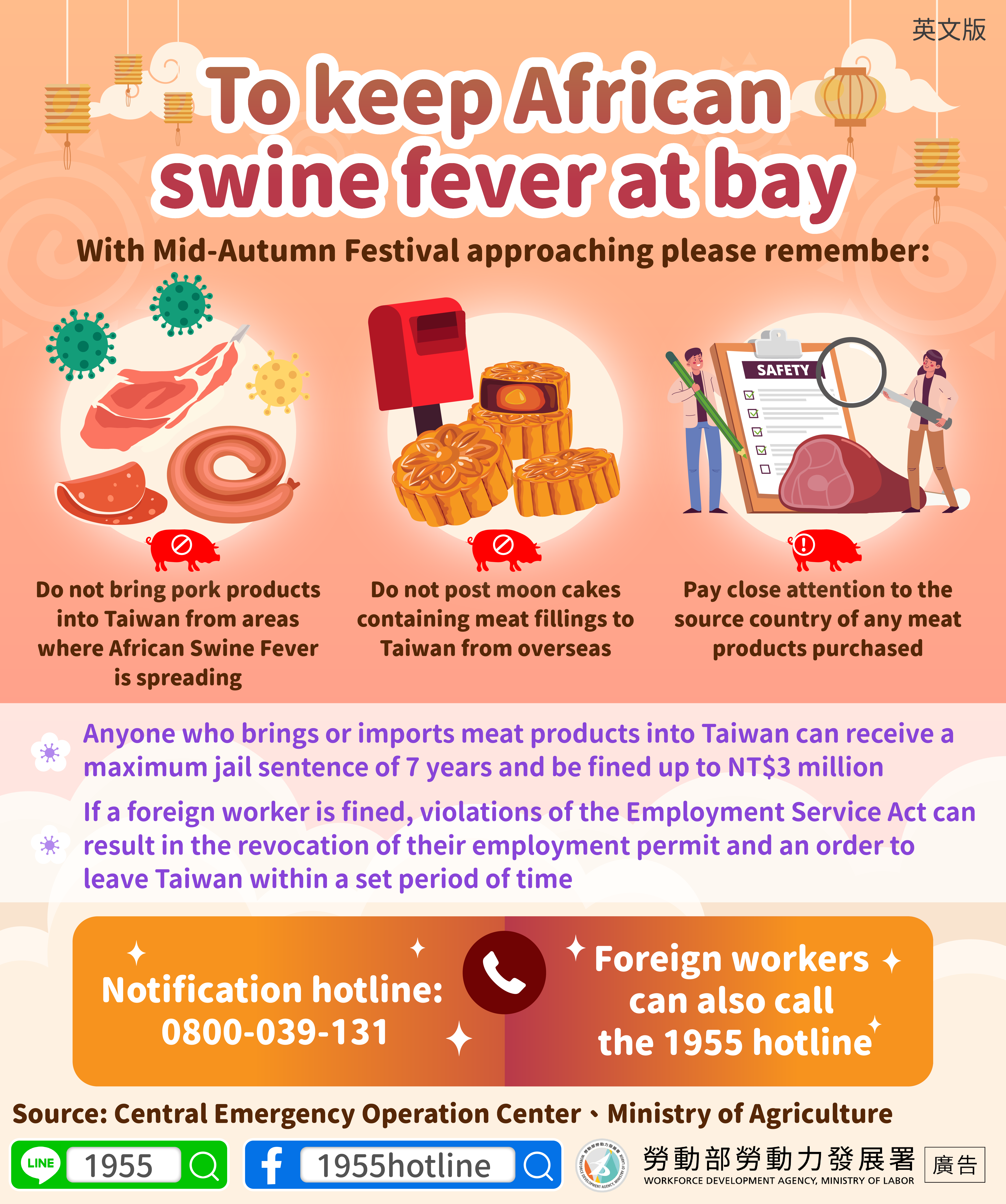 1.Do not bring pork products into Taiwan from areas where African Swine Fever is spreading