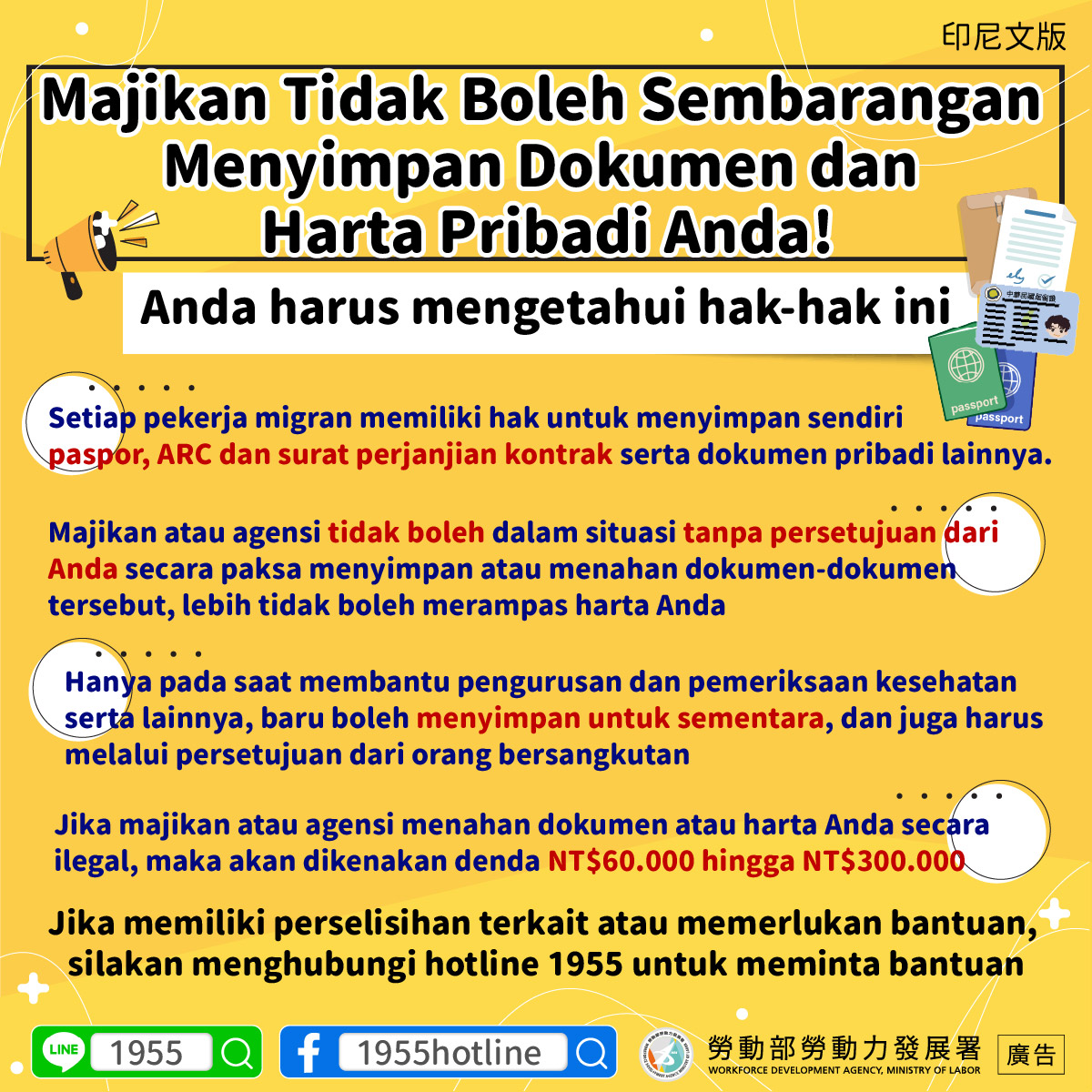 •Jika majikan atau agensi menahan dokumen atau harta Anda secara ilegal, maka akan dikenakan denda NT$60.000 hingga NT$300.000