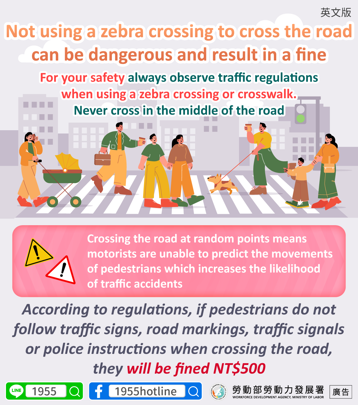 According to regulations, if pedestrians do not follow traffic signs, road markings, traffic signals or police instructions when crossing the road, they will be fined NT$500