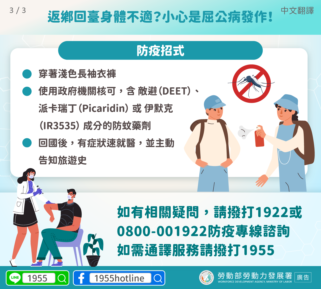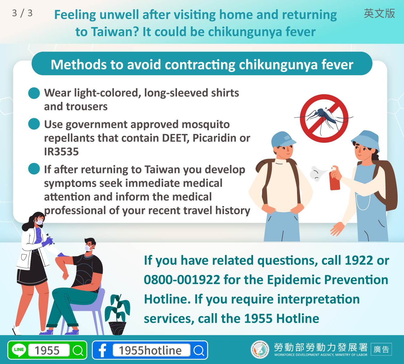 If you have related questions, call 1922 or 0800-001922 for the Epidemic Prevention Hotline. If you require interpretation services, call the 1955 Hotline