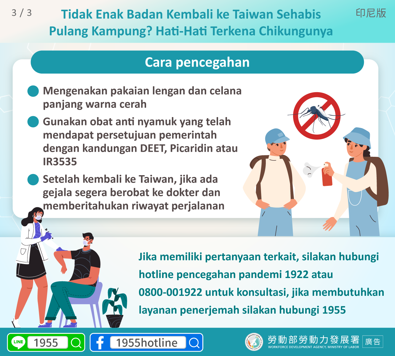 Jika memiliki pertanyaan terkait, silakan hubungi hotline pencegahan pandemi 1922 atau 0800-001922 untuk konsultasi, jika membutuhkan layanan penerjemah silakan hubungi 1955