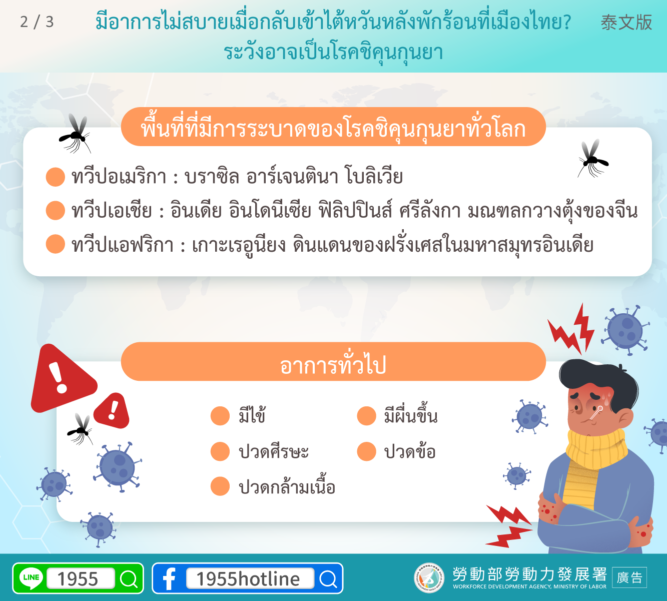 หากมีข้อสงสัย โปรดโทรสายด่วนป้องกันโรค 1922 หรือ 0800-001922 เพื่อขอคำปรึกษา หากต้องการล่ามแปลภาษากรุณาโทร 1955