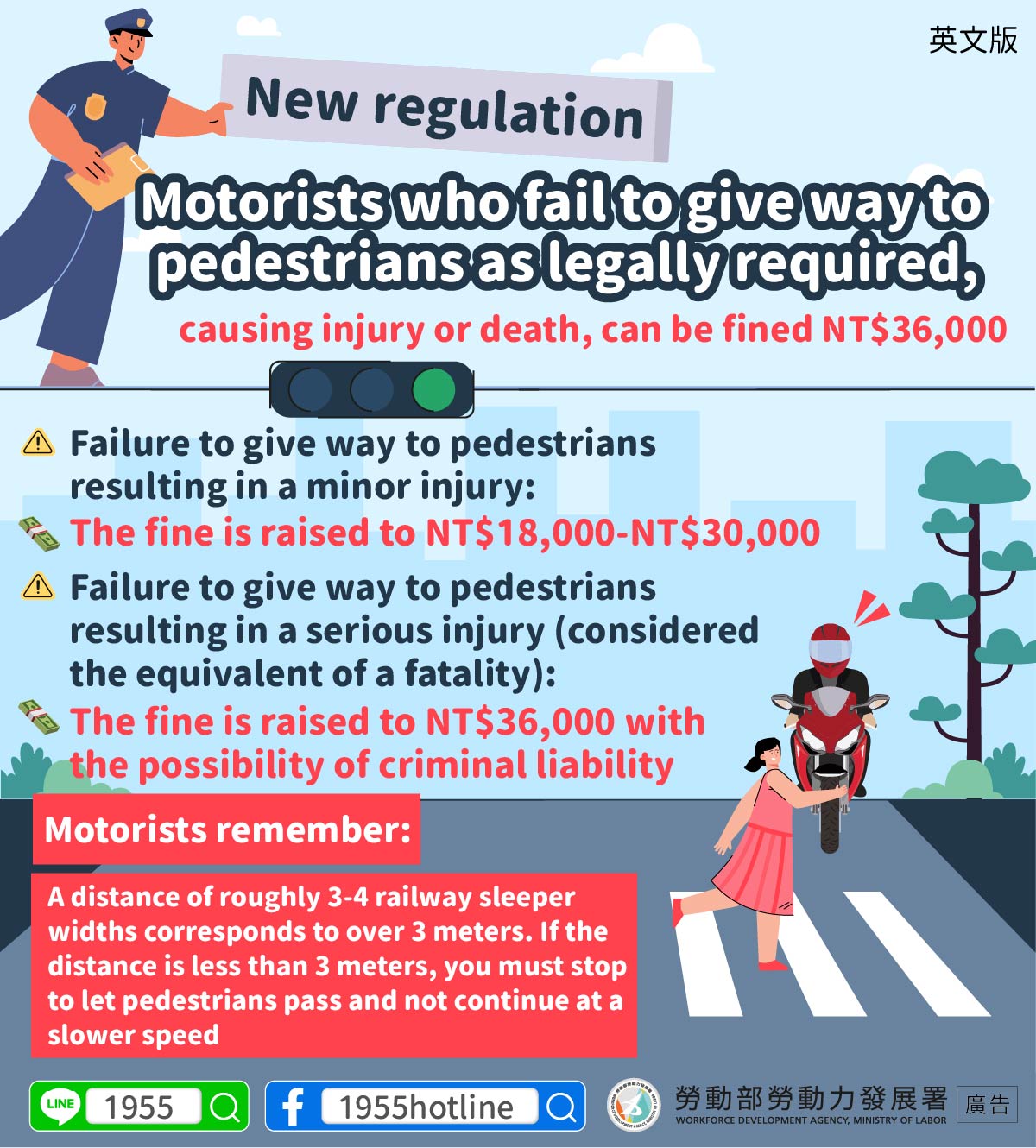 •Failure to give way to pedestrians resulting in a serious injury (considered the equivalent of a fatality) : The fine is raised to NT$36,000 with the possibility of criminal liability