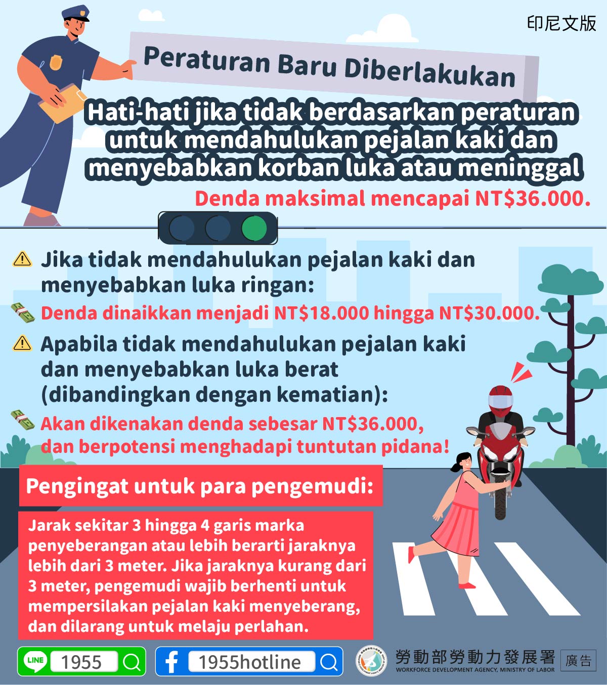 •Apabila tidak mendahulukan pejalan kaki dan menyebabkan luka berat (dibandingkan dengan kematian) : Akan dikenakan denda sebesar NT$36.000, dan berpotensi menghadapi tuntutan pidana!