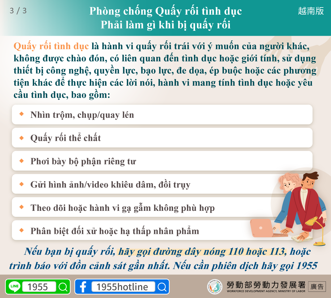 Nếu bạn bị quấy rối, hãy gọi đường dây nóng 110 hoặc 113, hoặc trình báo với đồn cảnh sát gần nhất. Nếu cần phiên dịch hãy gọi 1955