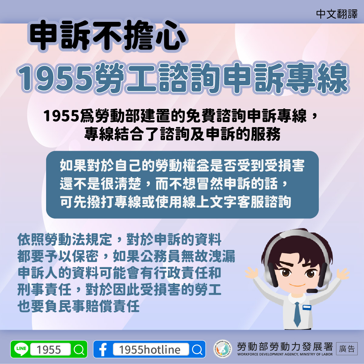 1955為勞動部建置的免費諮詢申訴專線,專線結合了諮詢及申訴的服務