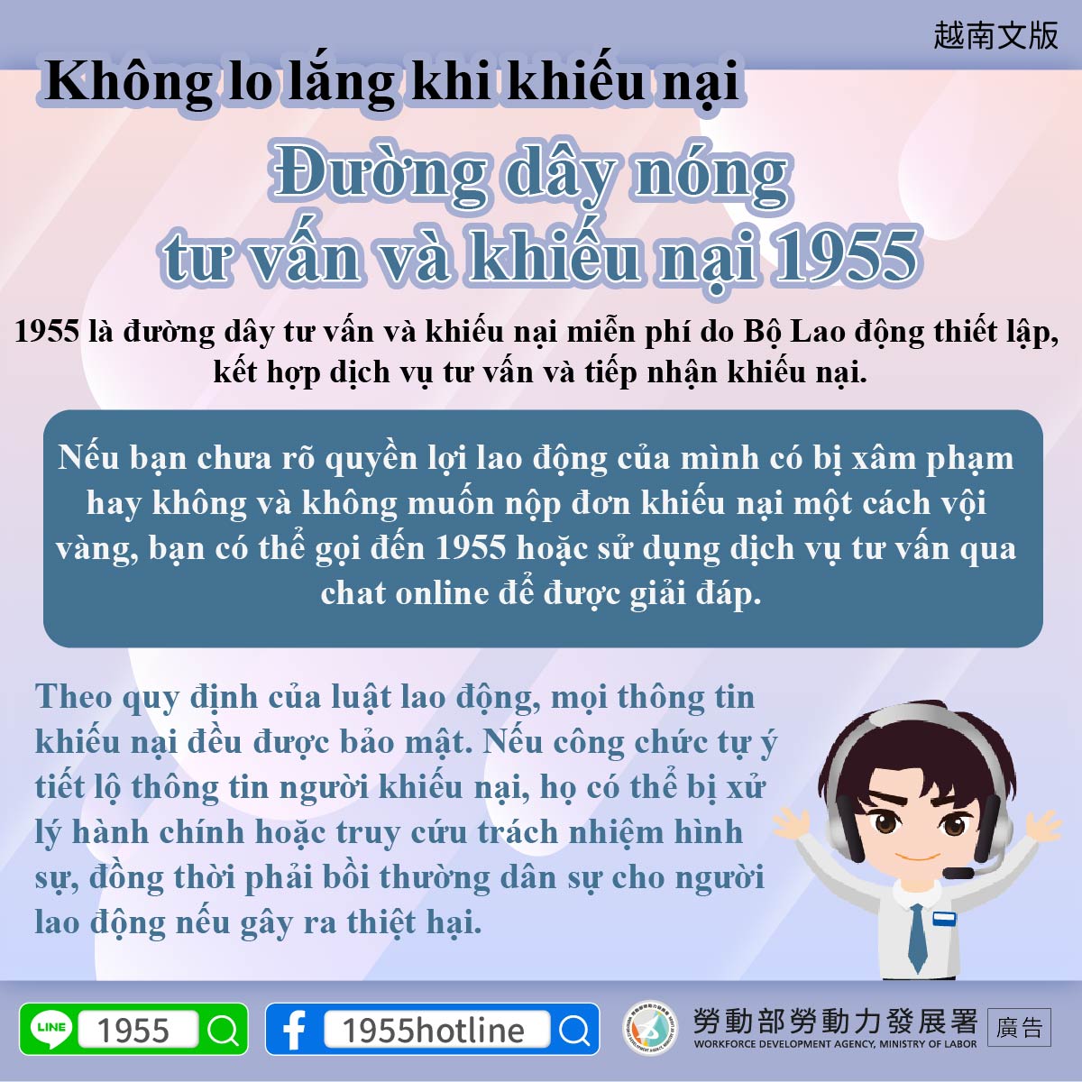 1955 là đường dây tư vấn và khiếu nại miễn phí do Bộ Lao động thiết lập, kết hợp dịch vụ tư vấn và tiếp nhận khiếu nại.