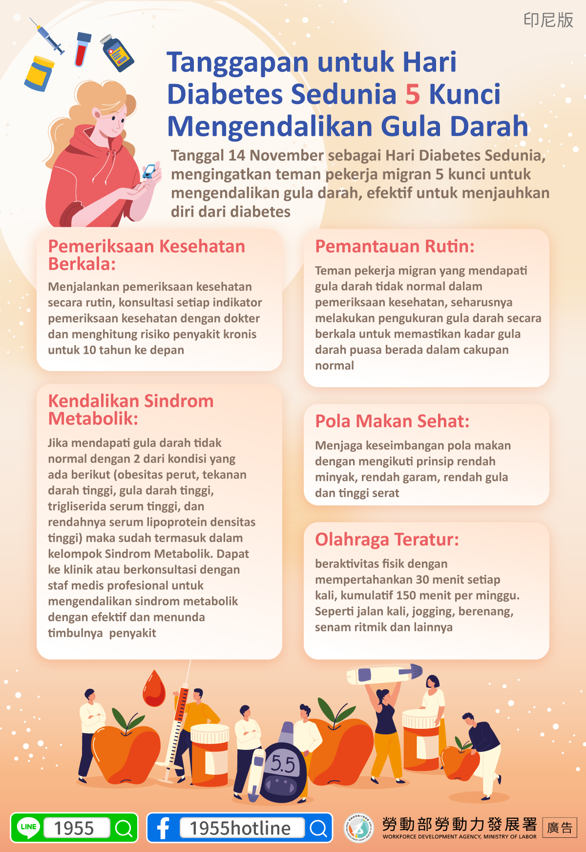 Pemantauan Rutin : Teman pekerja migran yang mendapati gula darah tidak normal dalam pemeriksaan kesehatan, seharusnya melakukan pengukuran gula darah secara berkala untuk memastikan kadar gula darah puasa berada dalam cakupan normal