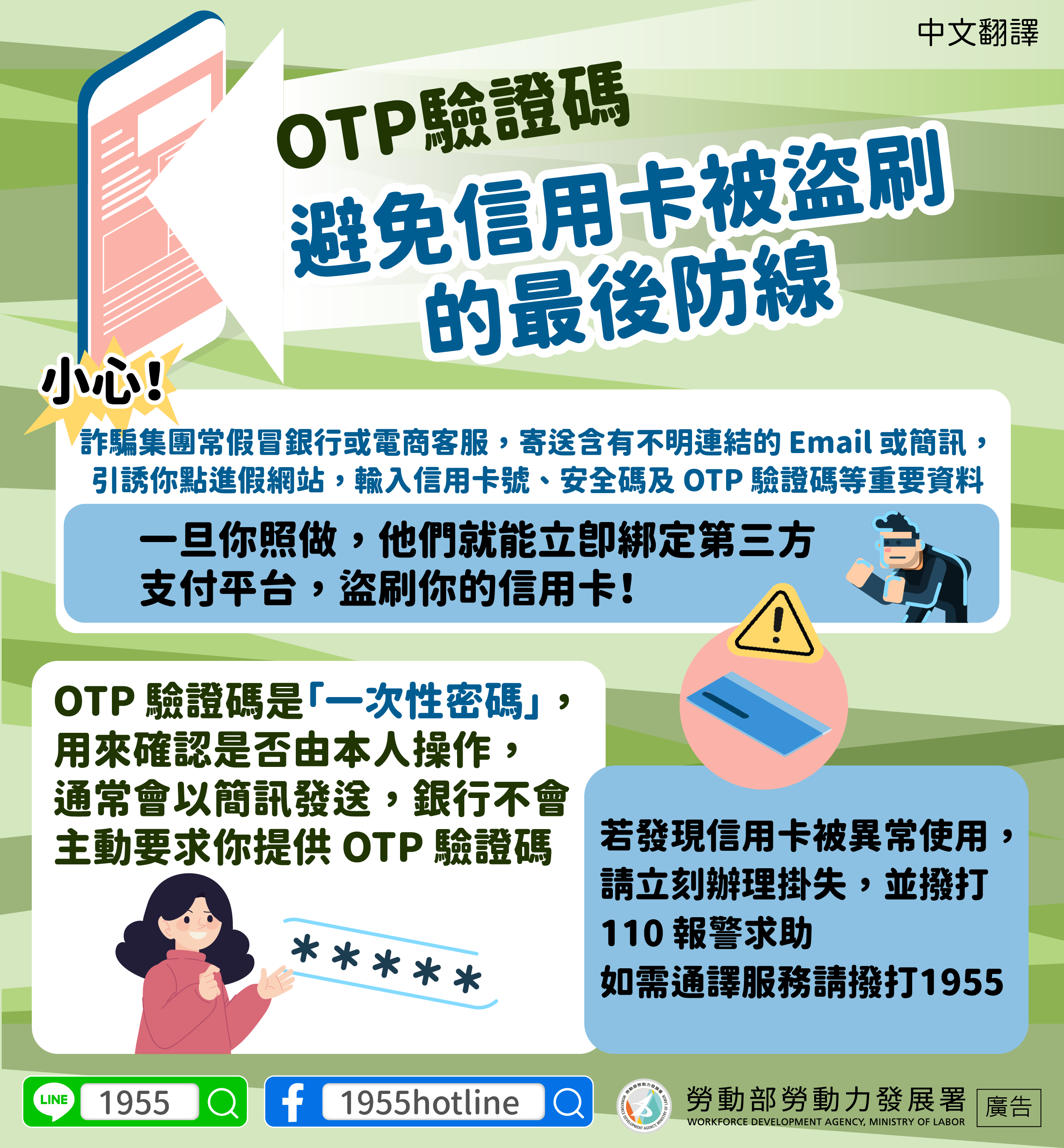 OTP 驗證碼是「一次性密碼」,用來確認是否由本人操作,通常會以簡訊發送,銀行不會主動要求你提供 OTP 驗證碼
