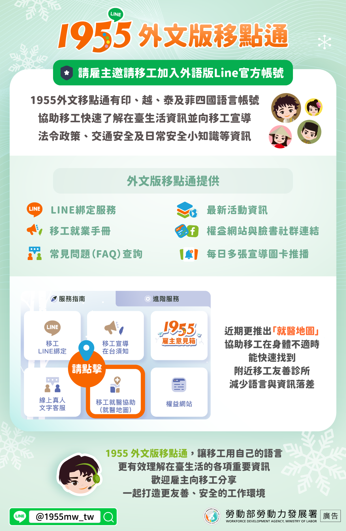 1955外文移點通有印、越、泰及菲四國語言帳號協助移工快速了解在臺生活資訊並向移工宣導法令政策、交通安全及日常安全小知識等資訊