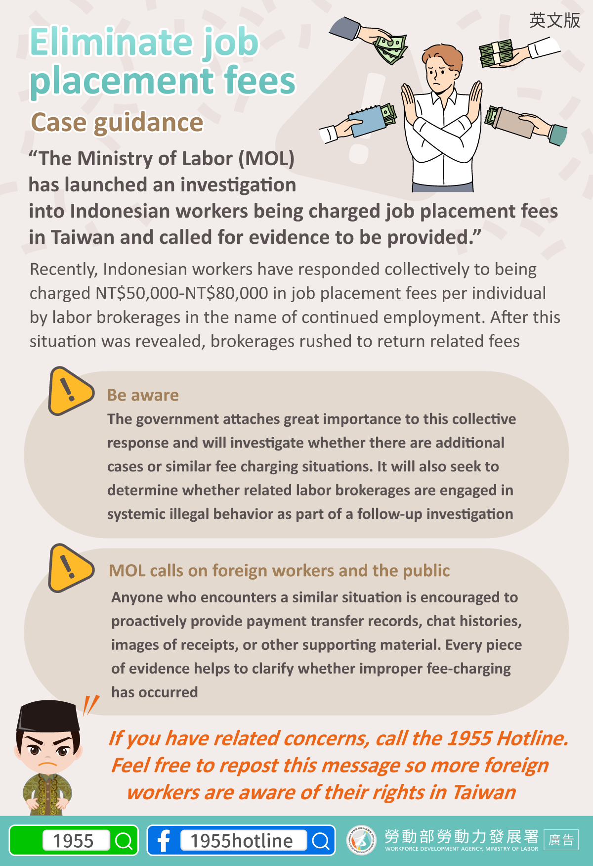 If you have related concerns, call the 1955 Hotline. Feel free to repost this message so more foreign workers are aware of their rights in Taiwan