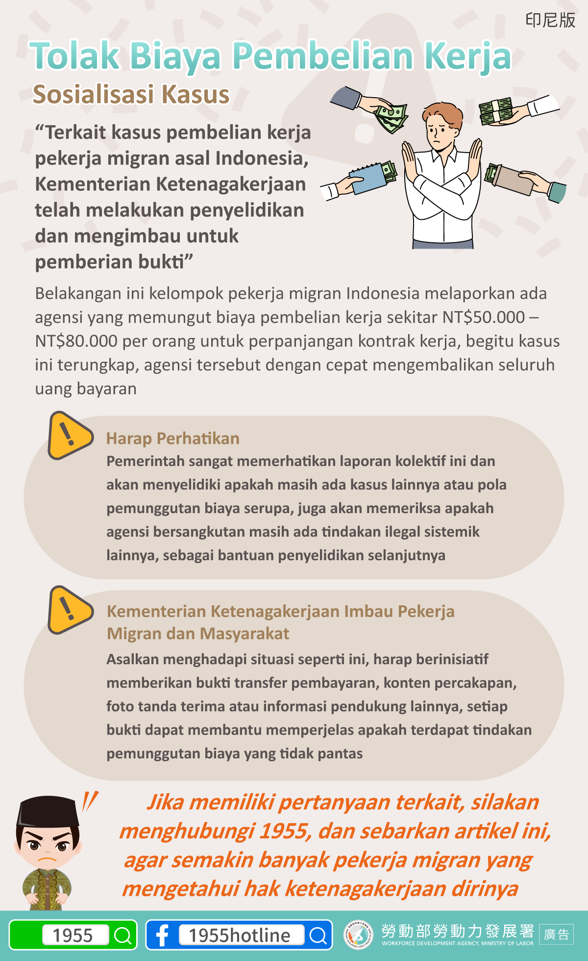Jika memiliki pertanyaan terkait, silakan menghubungi 1955, dan sebarkan artikel ini, agar semakin banyak pekerja migran yang mengetahui hak ketenagakerjaan dirinya