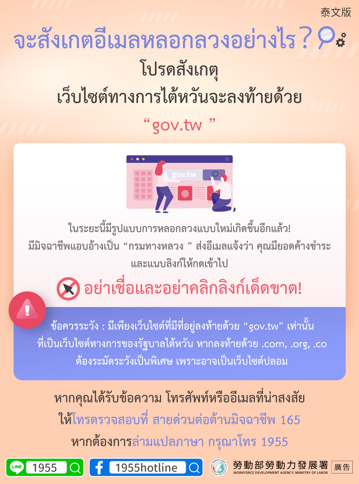 ▍จะสังเกตอีเมลหลอกลวงอย่างไร?โปรดสังเกตุเว็บไซต์ทางการไต้หวันจะลงท้ายด้วย“gov.tw ”