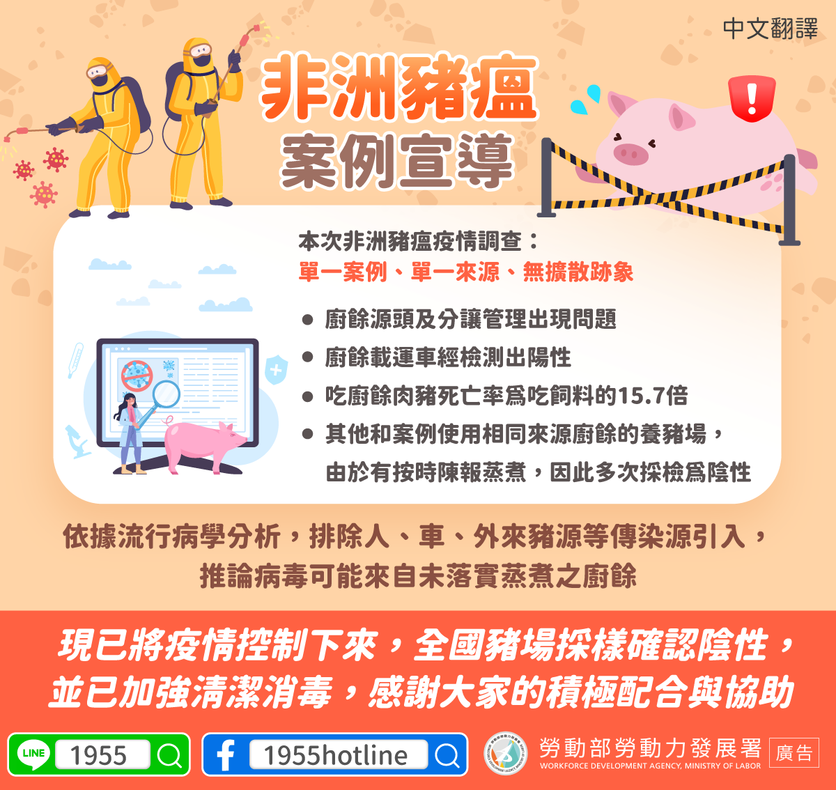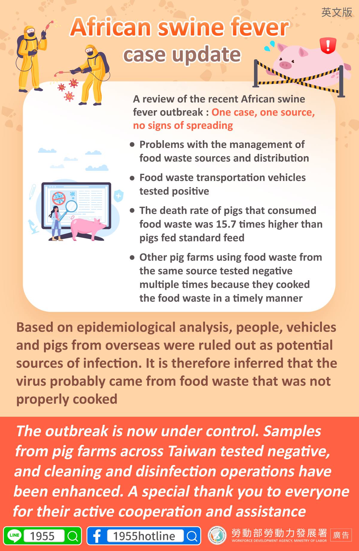 The outbreak is now under control. Samples from pig farms across Taiwan tested negative, and cleaning and disinfection operations have been enhanced. A special thank you to everyone for their active cooperation and assistance