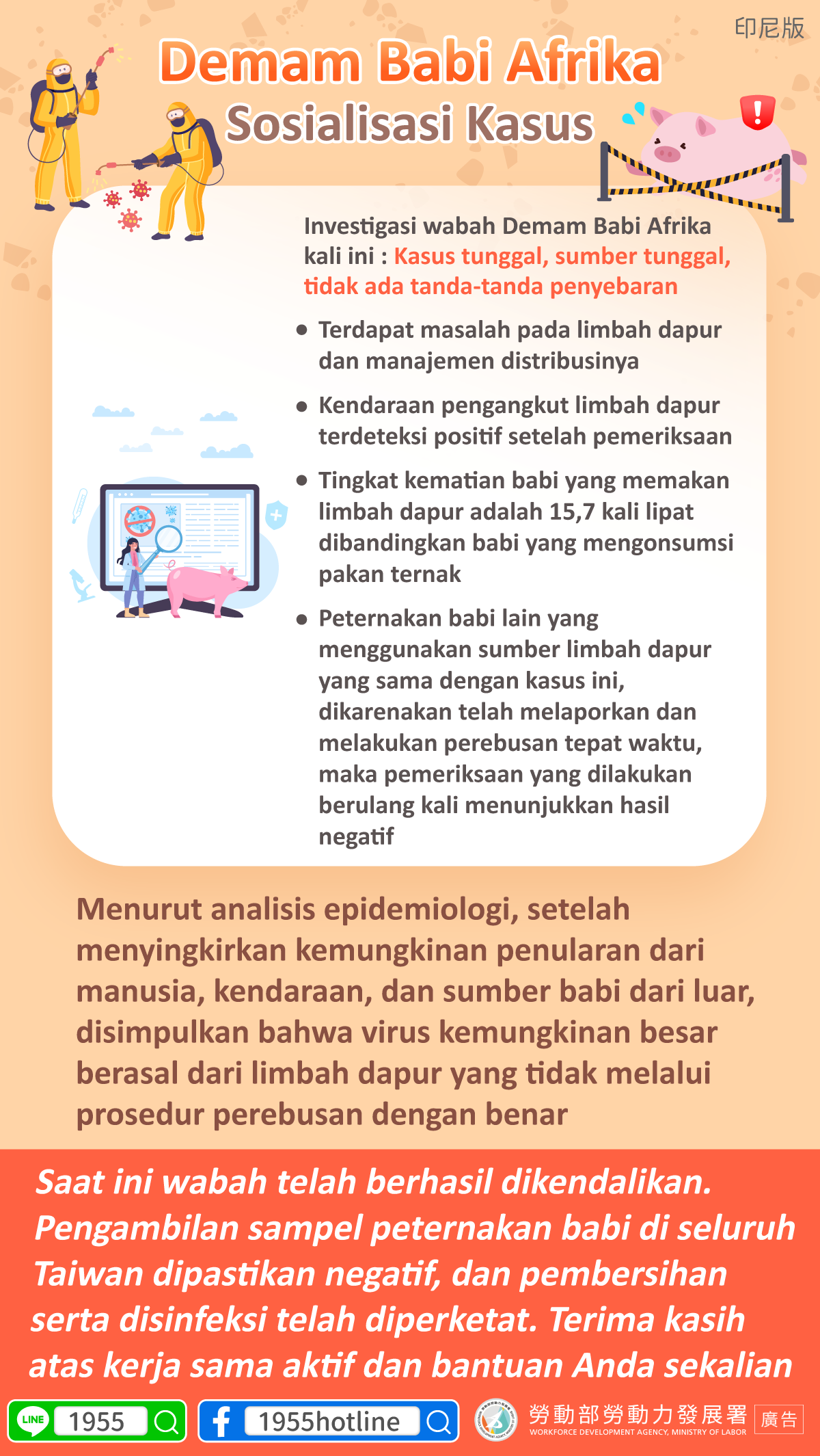 Saat ini wabah telah berhasil dikendalikan. Pengambilan sampel peternakan babi di seluruh Taiwan dipastikan negatif, dan pembersihan serta disinfeksi telah diperketat. Terima kasih atas kerja sama aktif dan bantuan Anda sekalian