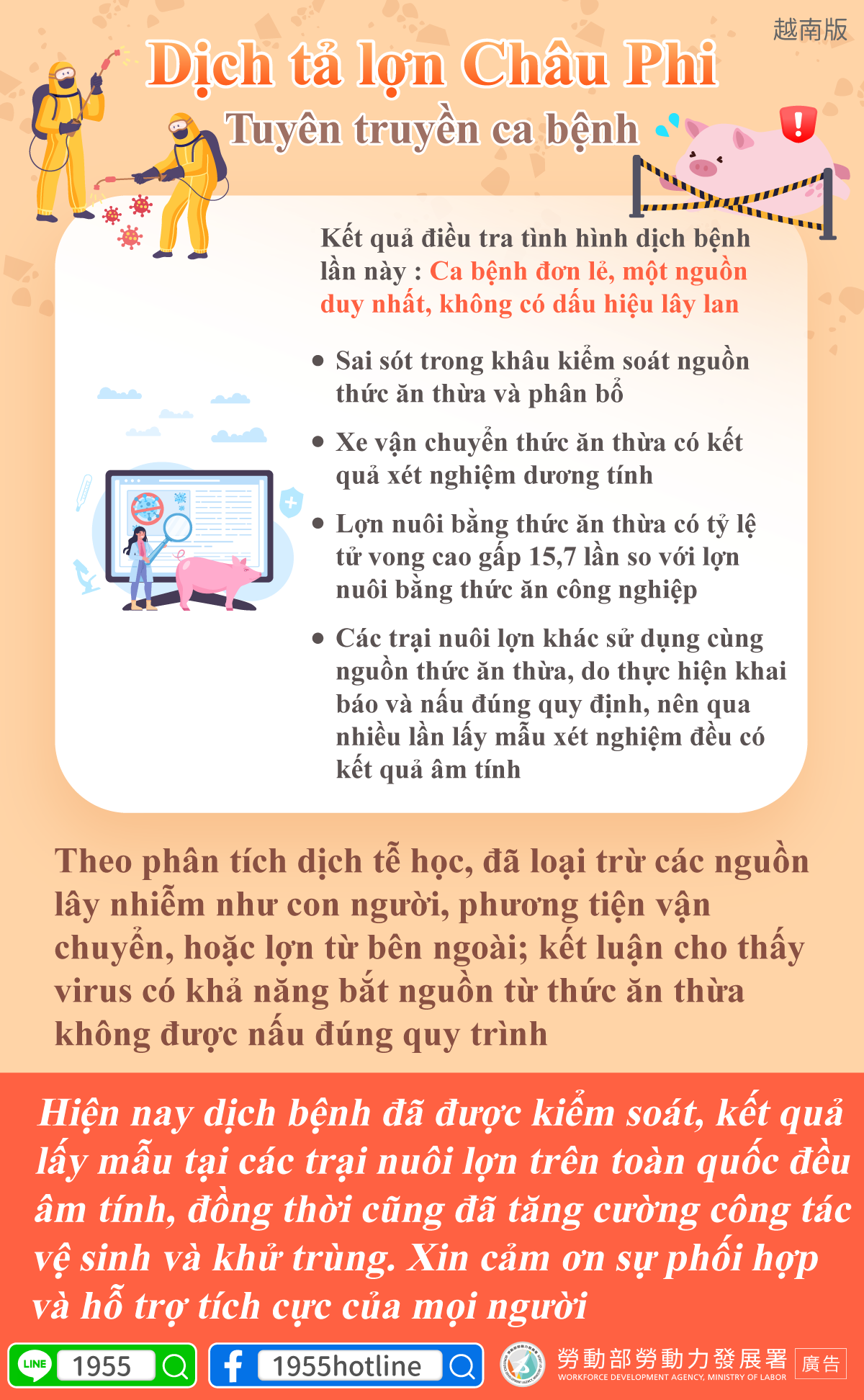 Hiện nay dịch bệnh đã được kiểm soát, kết quả lấy mẫu tại các trại nuôi lợn trên toàn quốc đều âm tính, đồng thời cũng đã tăng cường công tác vệ sinh và khử trùng. Xin cảm ơn sự phối hợp và hỗ trợ tích cực của mọi người