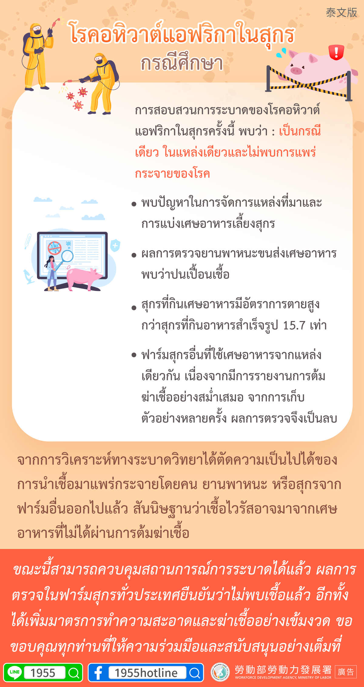 ขณะนี้สามารถควบคุมสถานการณ์การระบาดได้แล้ว ผลการตรวจในฟาร์มสุกรทั่วประเทศยืนยันว่าไม่พบเชื้อแล้ว อีกทั้งได้เพิ่มมาตรการทำความสะอาดและฆ่าเชื้ออย่างเข้มงวด ขอขอบคุณทุกท่านที่ให้ความร่วมมือและสนับสนุนอย่างเต็มที่