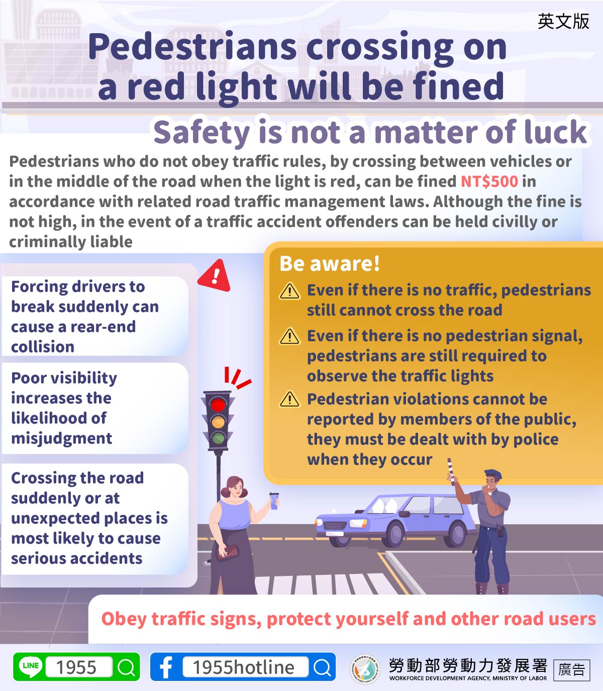 Pedestrians who do not obey traffic rules, by crossing between vehicles or in the middle of the road when the light is red, can be fined NT$500 in accordance with related road traffic management laws. Although the fine is not high, in the event of a traffic accident offenders can be held civilly or criminally liable
