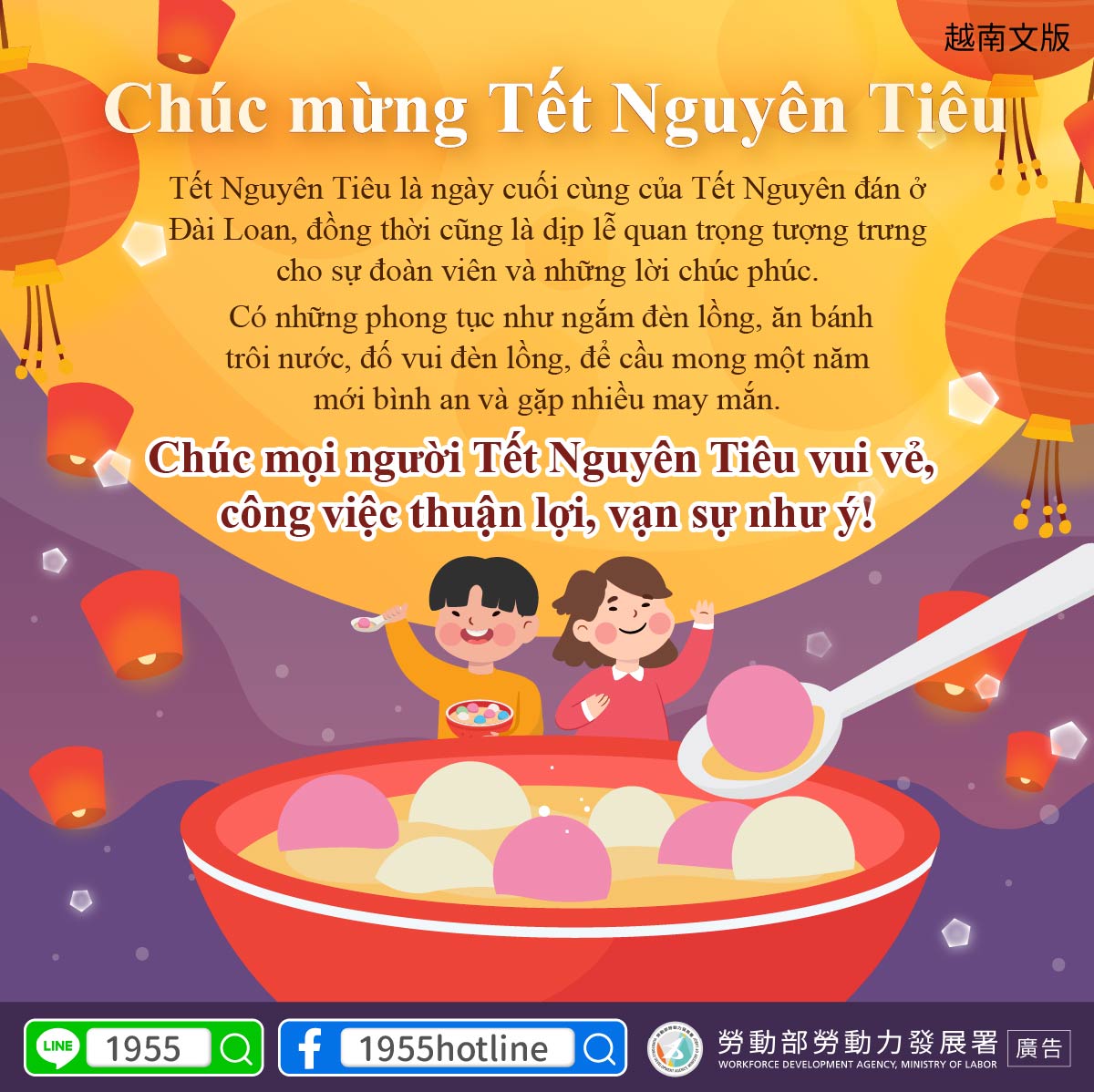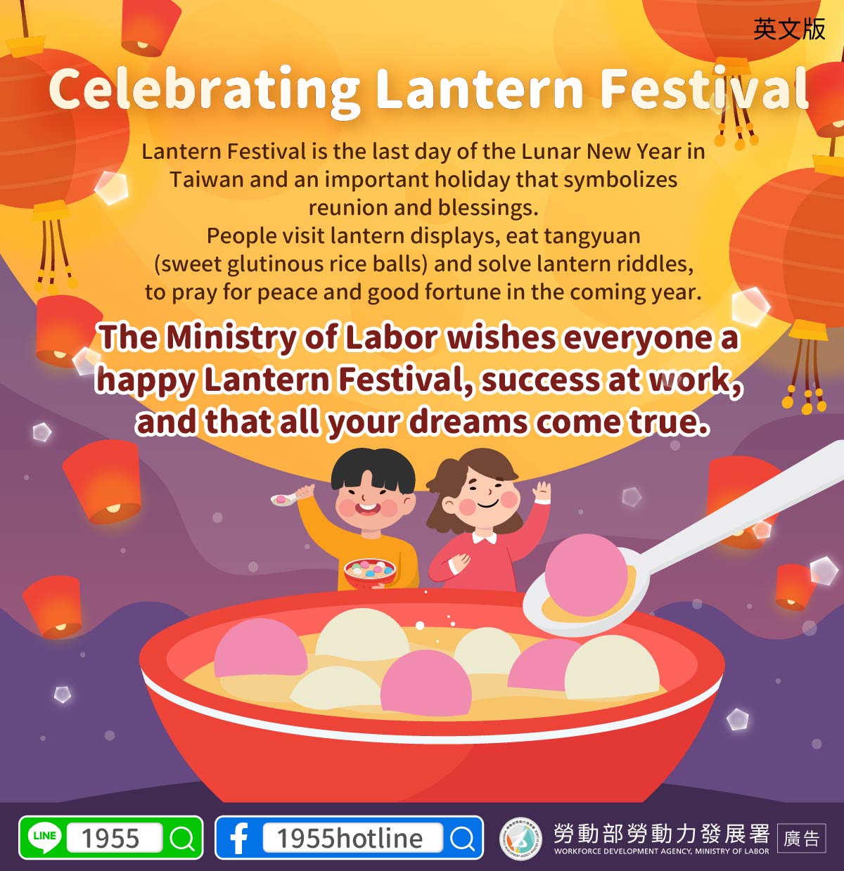 The Ministry of Labor wishes everyone a happy Lantern Festival, success at work, and that all your dreams come true.