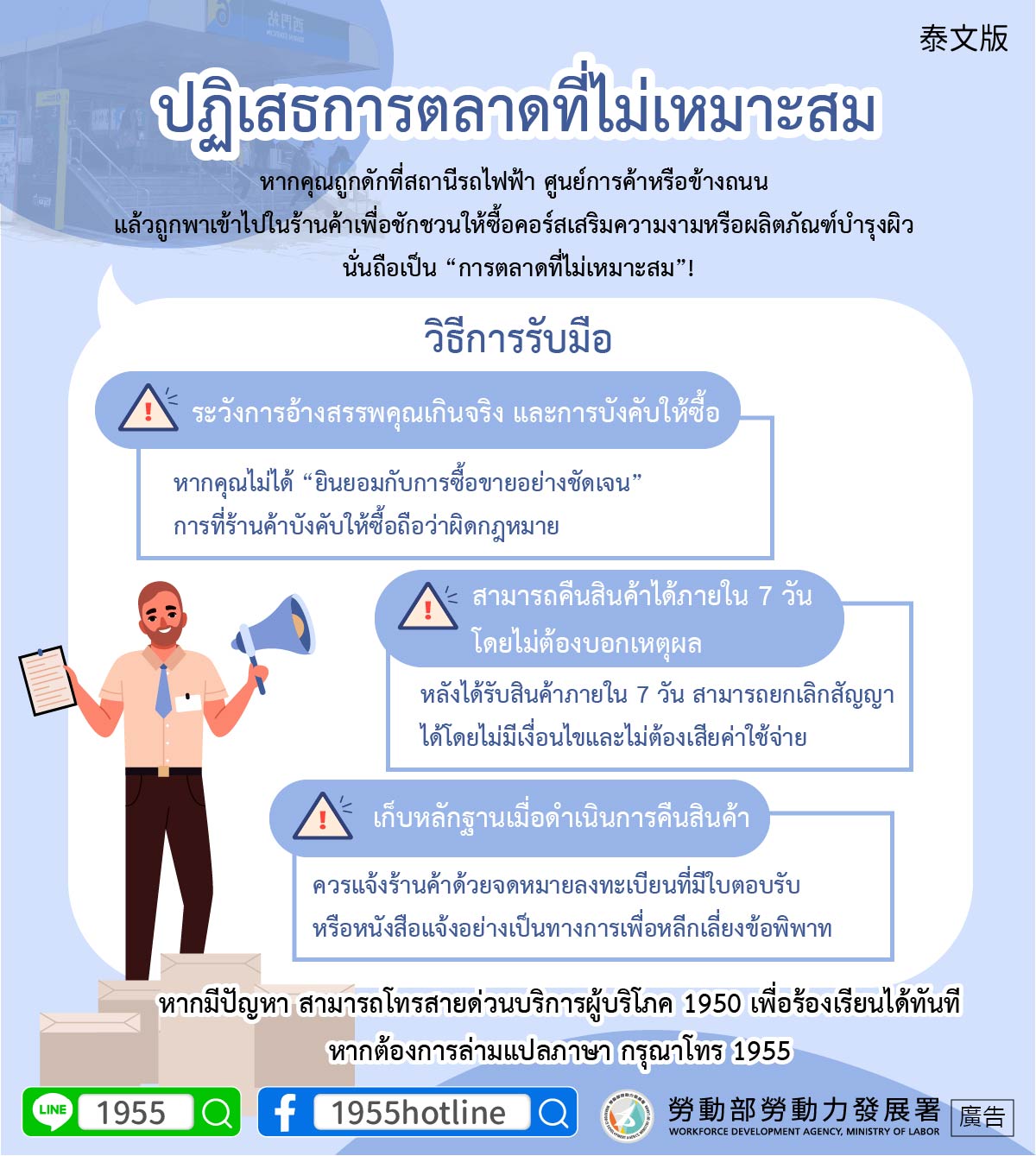 หากมีปัญหา สามารถโทรสายด่วนบริการผู้บริโภค 1950 เพื่อร้องเรียนได้ทันทีหากต้องการล่ามแปลภาษา กรุณาโทร 1955