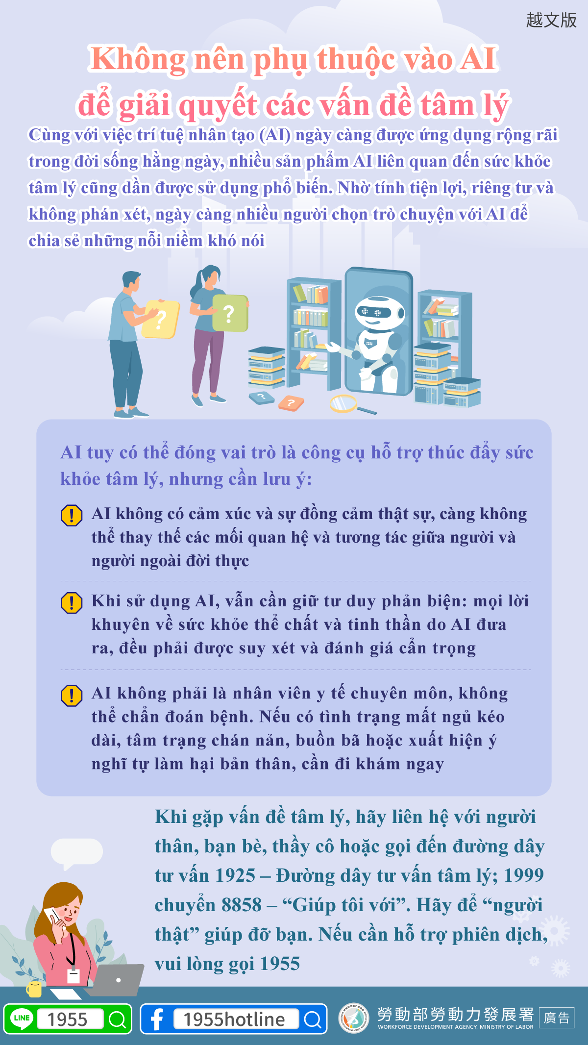 Khi gặp vấn đề tâm lý, hãy liên hệ với người thân, bạn bè, thầy cô hoặc gọi đến đường dây tư vấn 1925 – Đường dây tư vấn tâm lý; 1999 chuyển 8858 – “Giúp tôi với”. Hãy để “người thật” giúp đỡ bạn. Nếu cần hỗ trợ phiên dịch, vui lòng gọi 1955