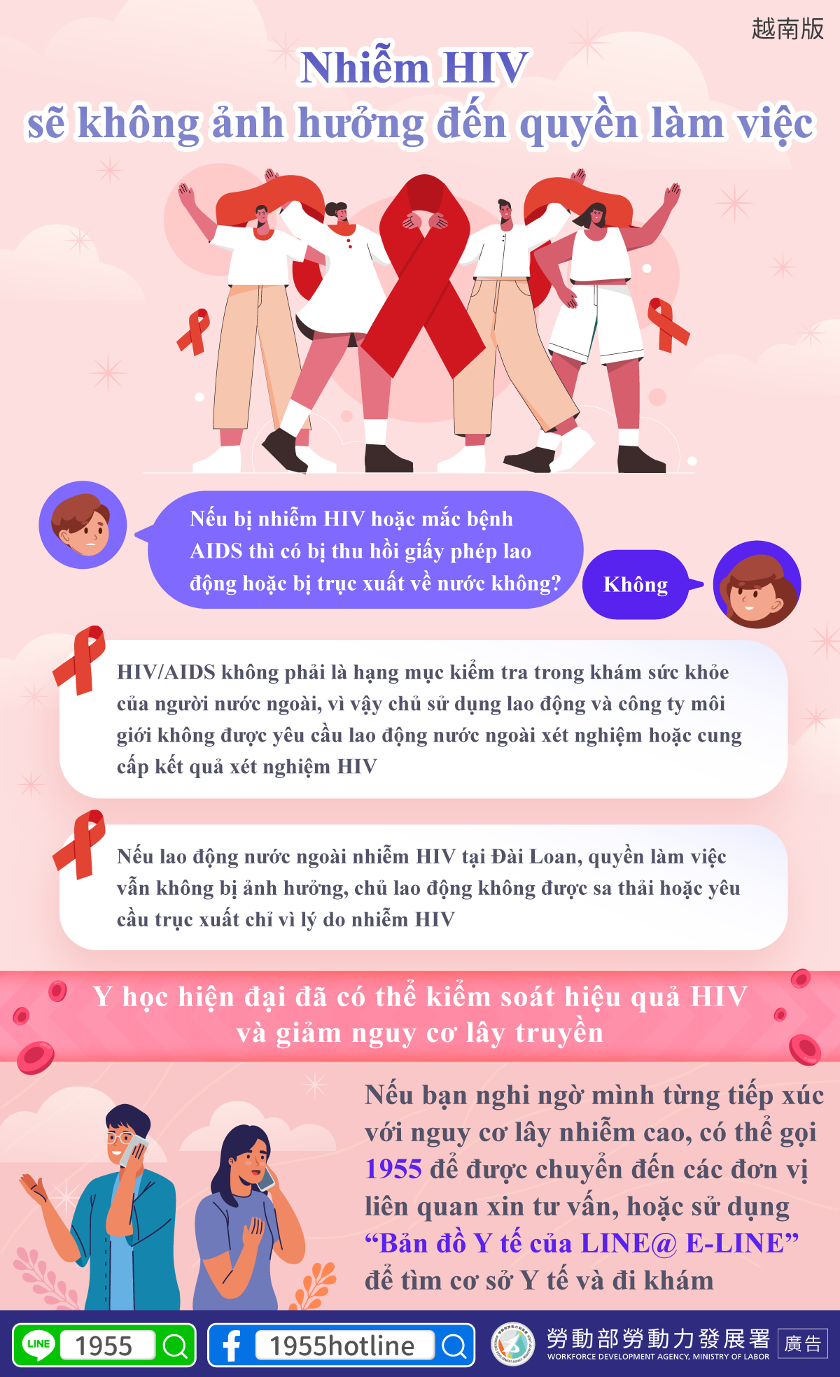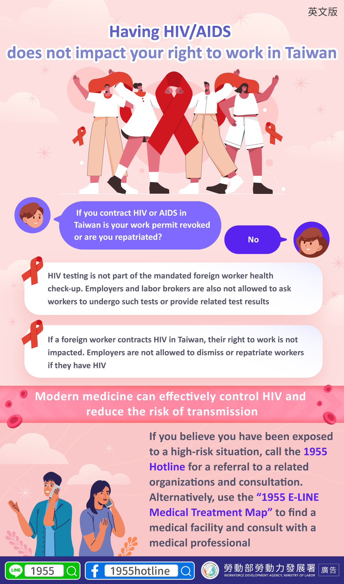 If a foreign worker contracts HIV in Taiwan, their right to work is not impacted. Employers are not allowed to dismiss or repatriate workers if they have HIV
