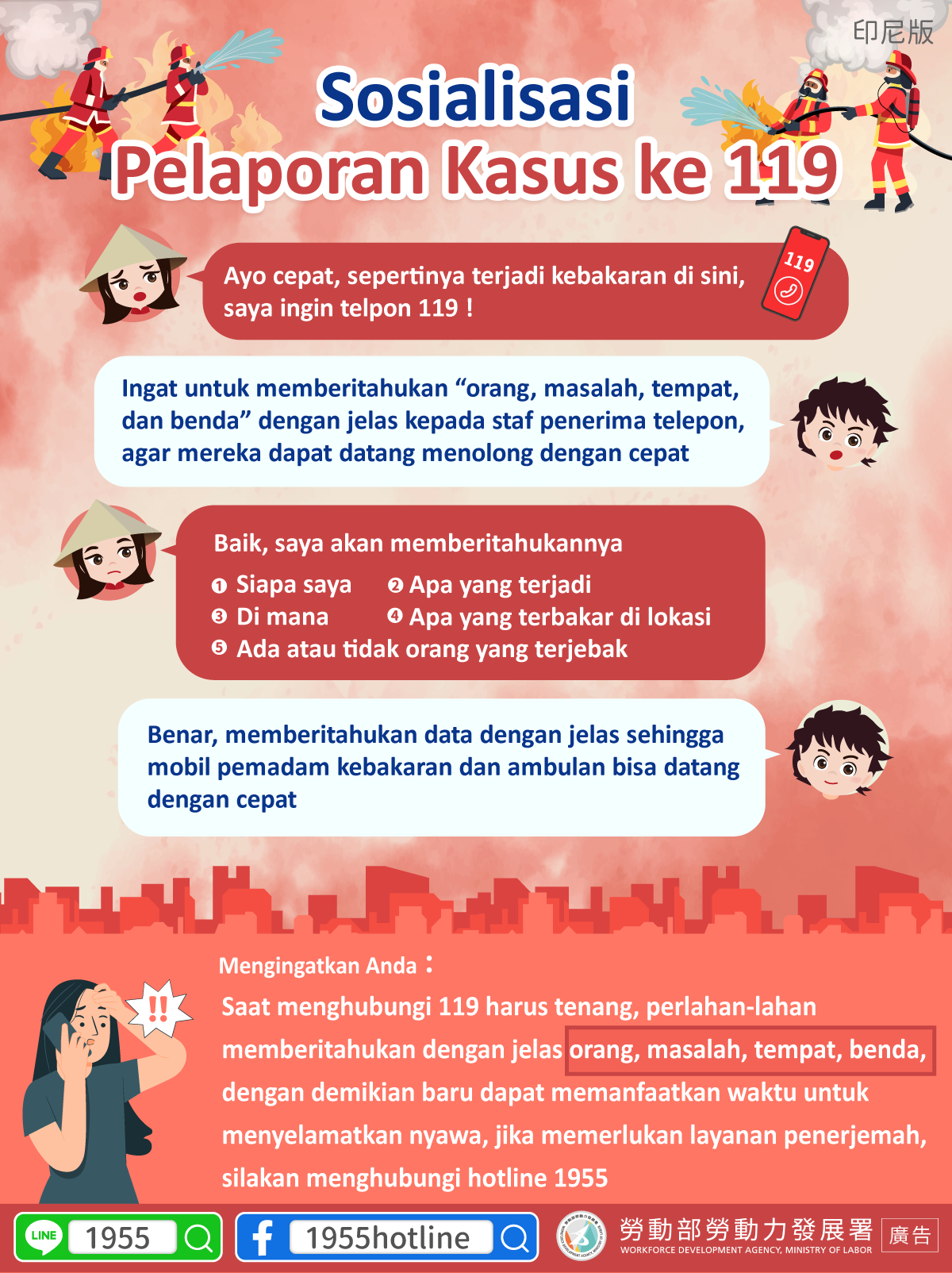 Mengingatkan Anda:Saat menghubungi 119 harus tenang, perlahan-lahan memberitahukan dengan jelas orang, masalah, tempat, benda, dengan demikian baru dapat memanfaatkan waktu untuk menyelamatkan nyawa, jika memerlukan layanan penerjemah, silakan menghubungi hotline 1955