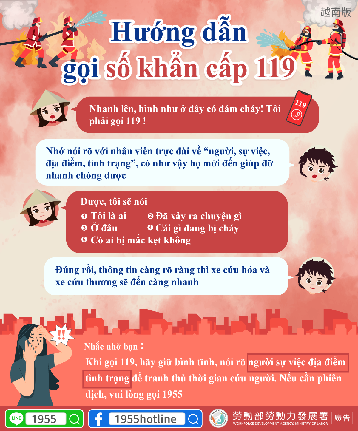 Nhắc nhở bạn:Khi gọi 119, hãy giữ bình tĩnh, nói rõ người sự việc địa điểm tình trạng để tranh thủ thời gian cứu người. Nếu cần phiên dịch, vui lòng gọi 1955