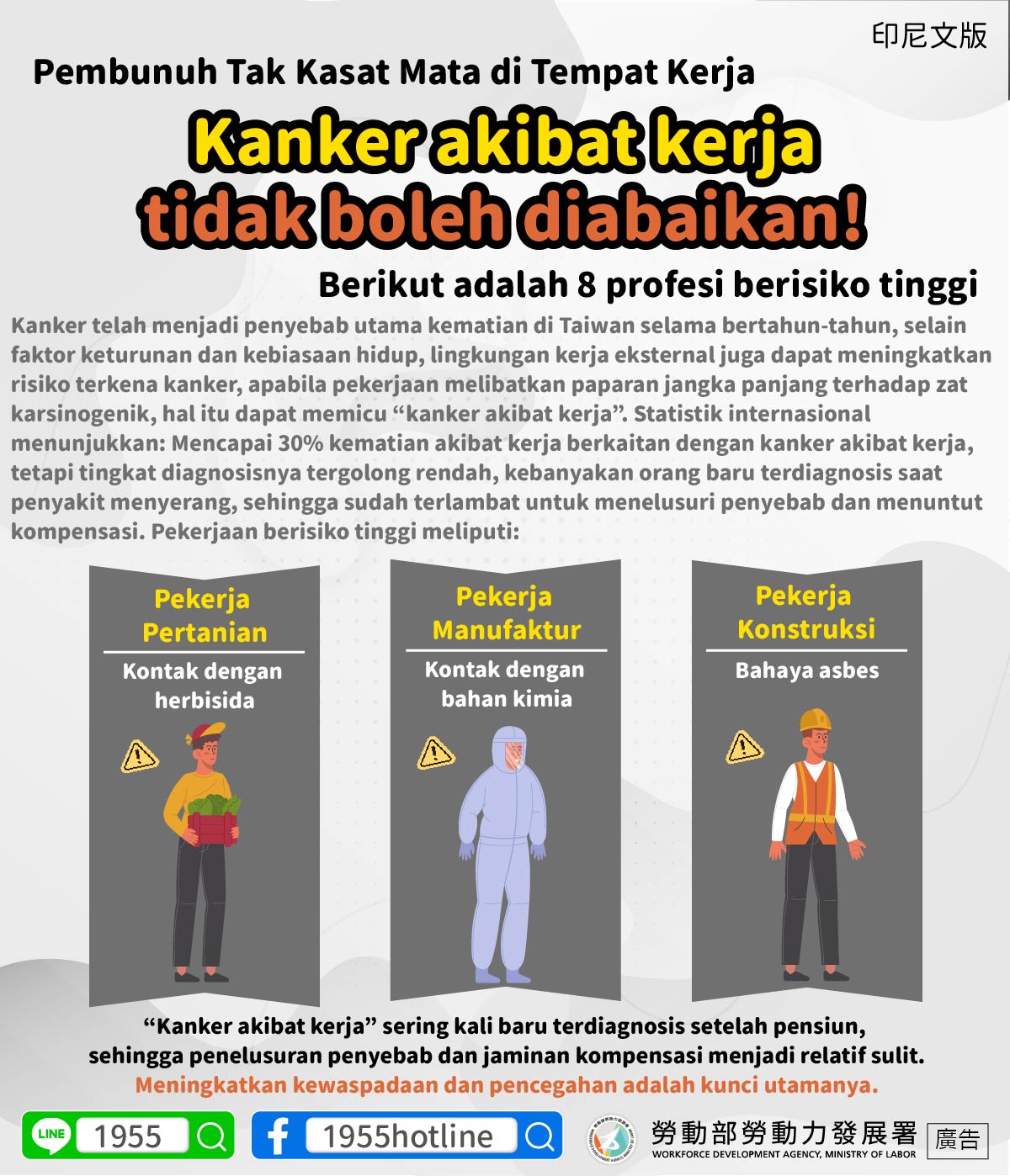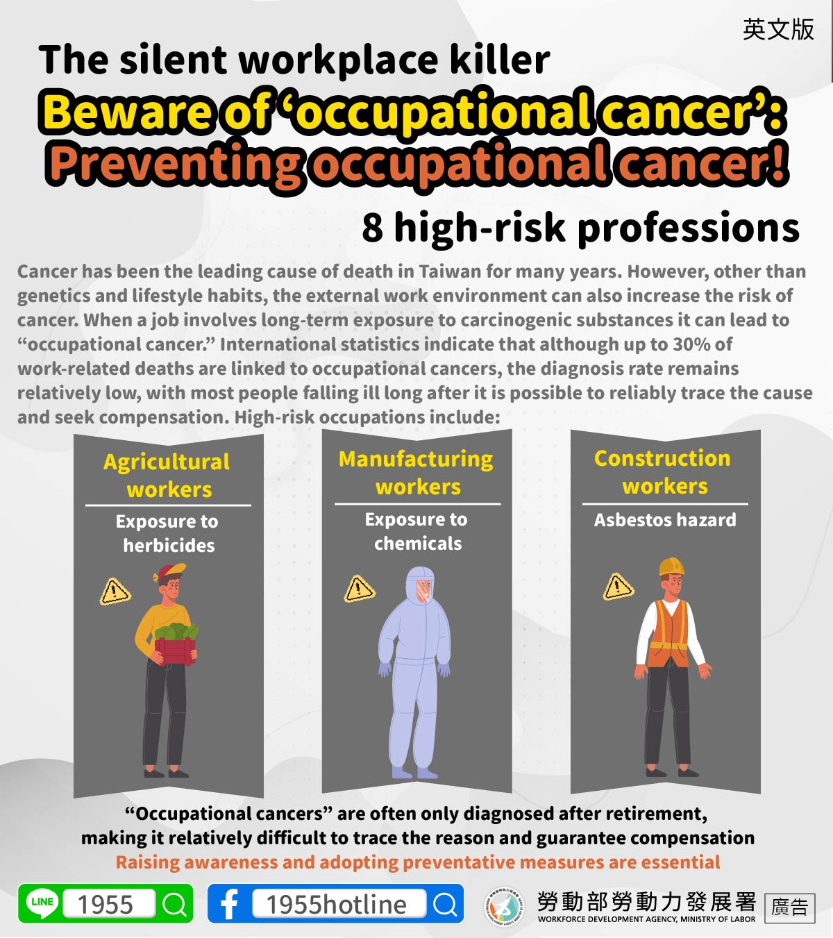 Kanker telah menjadi penyebab utama kematian di Taiwan selama bertahun-tahun, selain faktor keturunan dan kebiasaan hidup, lingkungan kerja eksternal juga dapat meningkatkan risiko terkena kanker, apabila pekerjaan melibatkan paparan jangka panjang terhadap zat karsinogenik, hal itu dapat memicu “kanker akibat kerja”. Statistik internasional menunjukkan: Mencapai 30% kematian akibat kerja berkaitan dengan kanker akibat kerja, tetapi tingkat diagnosisnya tergolong rendah, kebanyakan orang baru terdiagnosis saat penyakit menyerang, sehingga sudah terlambat untuk menelusuri penyebab dan menuntut kompensasi. Pekerjaan berisiko tinggi meliputi: